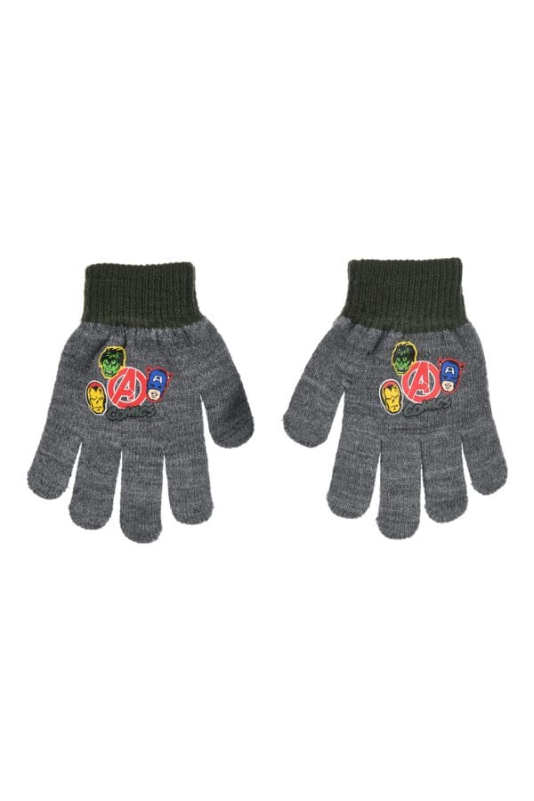 Avengers barnvantar i grått, tillverkade av en blandning av 43 % akryl, 56 % polyester och 1 % elastan. Ett par vantar som ger värme och komfort för barn.