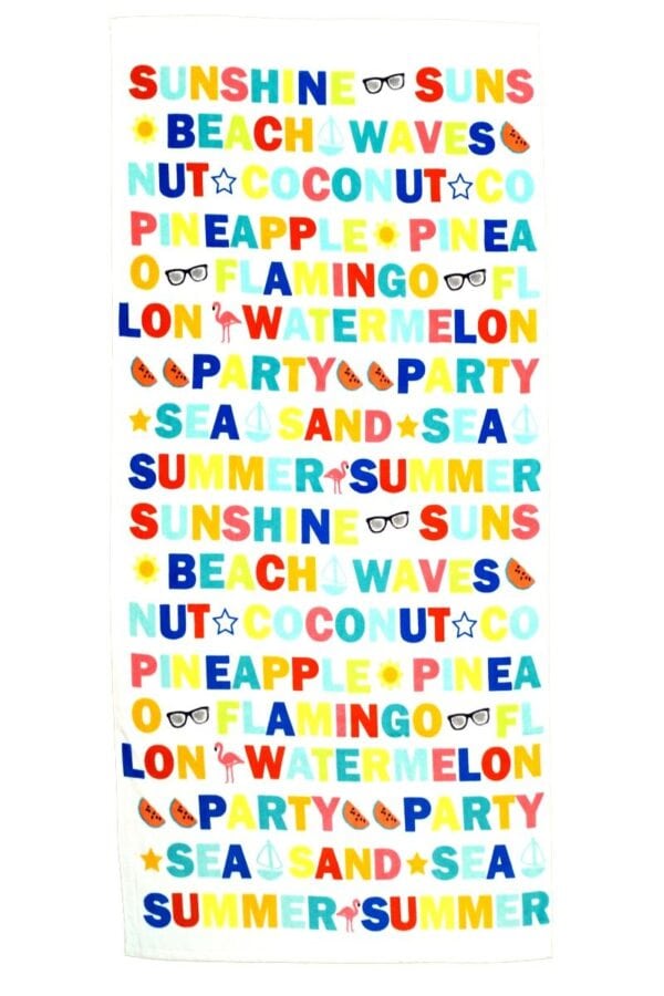 Ett roligt och färglatt badlakan med en massa bokstäver på.